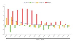 では、「橋本」駅周辺のデータ面からの現況について見ていきましょう。 2020年に行われた国勢調査によると、「橋本」駅が位置する相模原市の人口は72万5,493人です。5年前の調査と比較すると0.7%の微増となっており、政令指定都市として底堅い人口基盤を維持しています。その中でも橋本駅がある「緑区」は、リニア中央新幹線の駅設置決定以降、開発への期待感から社会増(転入超過)の傾向が見られ、市全体の牽引役となっています。